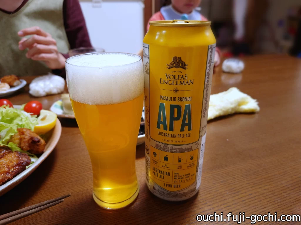 先日飲んだ IPA が史上トップクラスの美味しさだったことから、再びやまやの輸入品コーナーに足を運び、同じメーカーのビールをゲッツ。今回は VOLFAS ENGELMAN APA。APAというのは、Australian Pale Ale の略らしい。オーストラリアンって初耳。そしておなじみ、フタの上のアルミ箔。坂上田村麻呂。