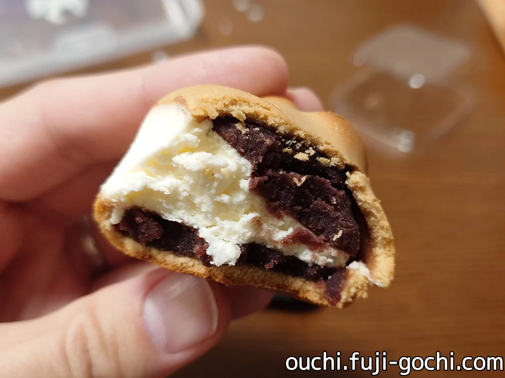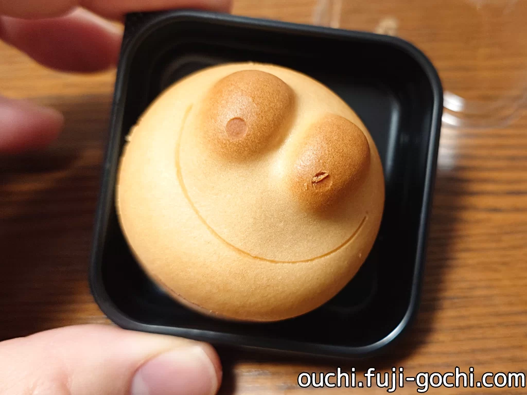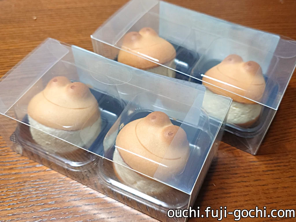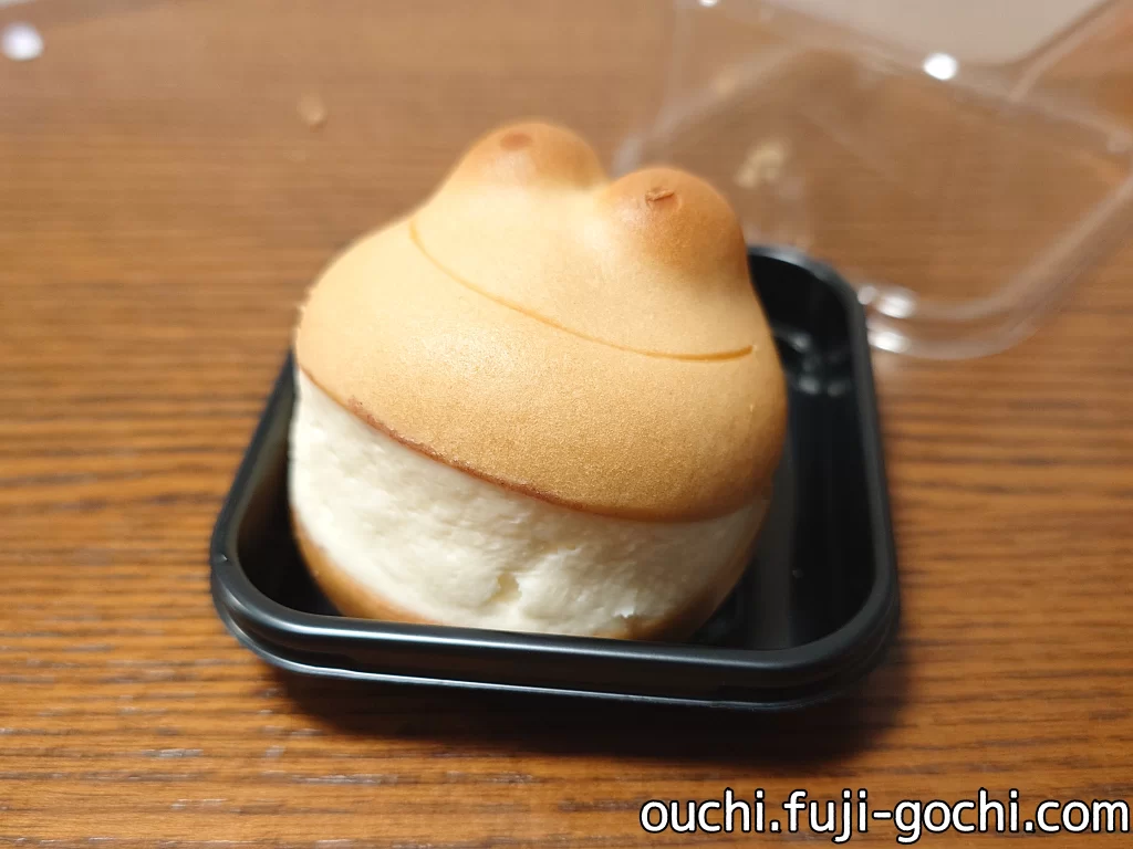新しい名古屋土産とのこと。そもそもカエル饅頭と言う、蛙を模した饅頭があって、それを横一文字に半分に切ってクリームチーズを挟んだもの。ただそれだけのことだがなかなか美味しい。よくある、ほっくり生地にしっとり餡子が優しい味わい。クリームチーズはさっぱりした味で、口溶けも軽いのでパクパクと食べられる。