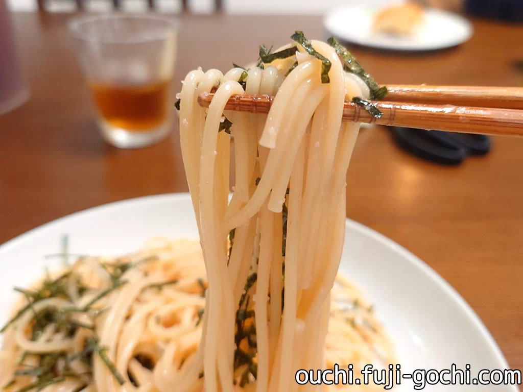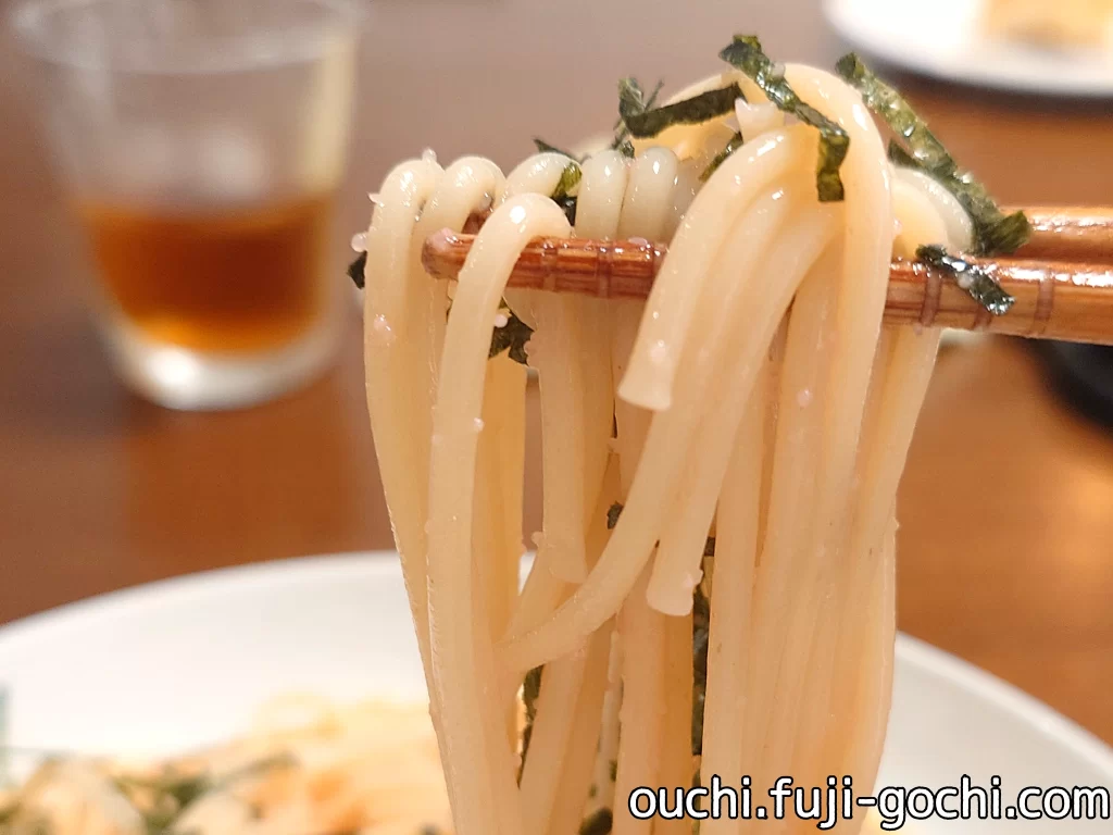 茹であげたパッツン系の中太パスタが口の中で踊る。スパゲッティをテフロンダイス(つるつる表面)のバリラ系と、ブロンズダイス(ざらざら表面)のディチェコ系に大別するならば、バリラ寄りの食感に思われる。しかしパッケージにはブロンズ引き(Trafilata al bronzo/Bronze drawn)とある。テフロン寄りのブロンズということかな?もしかすると茹ですぎたのかも知れない。つるりとしてハリある滑らかな表面は、ミートやスープよりも、麺にまとわせるオイル系との相性が良いように思われた。
