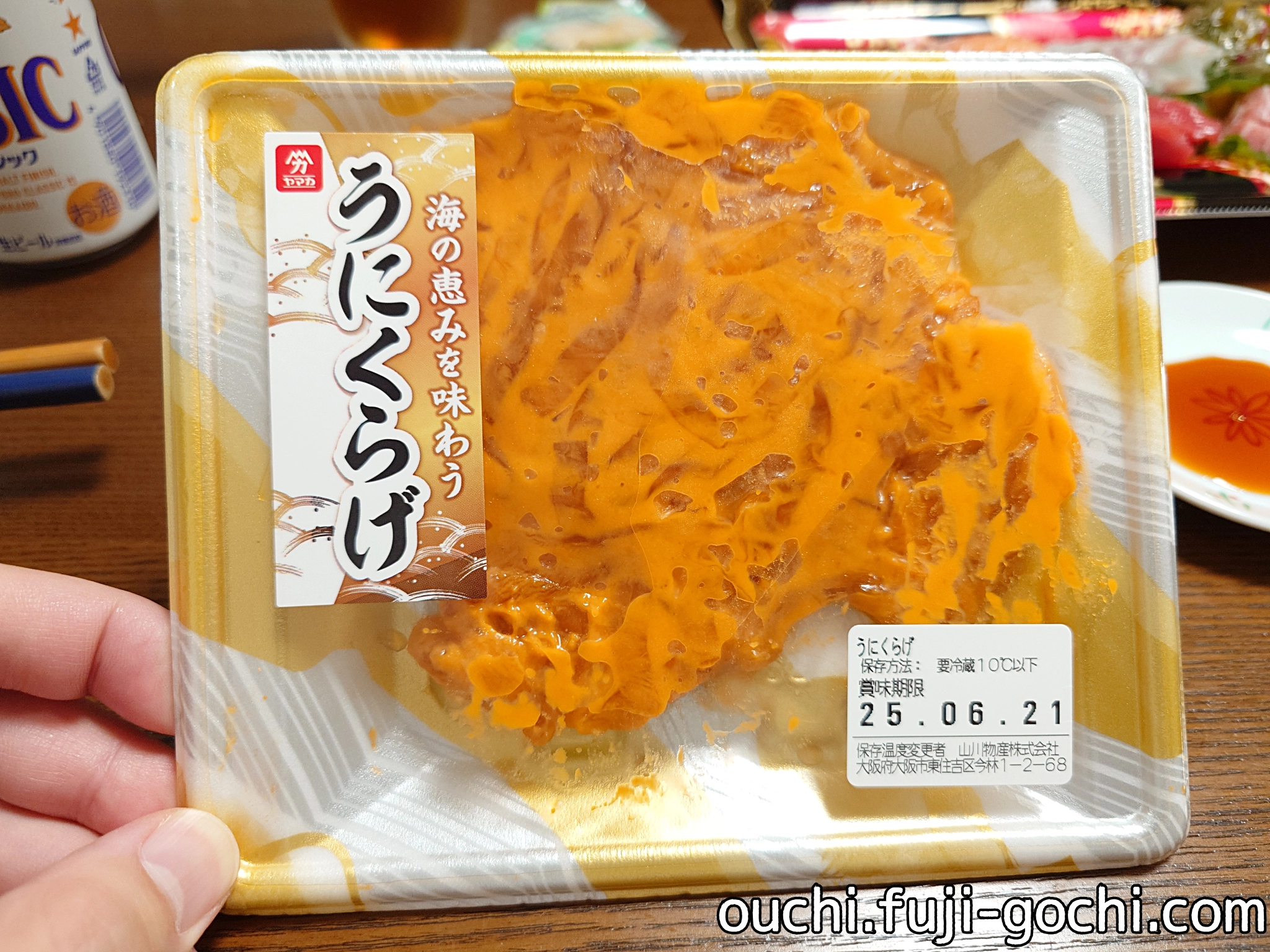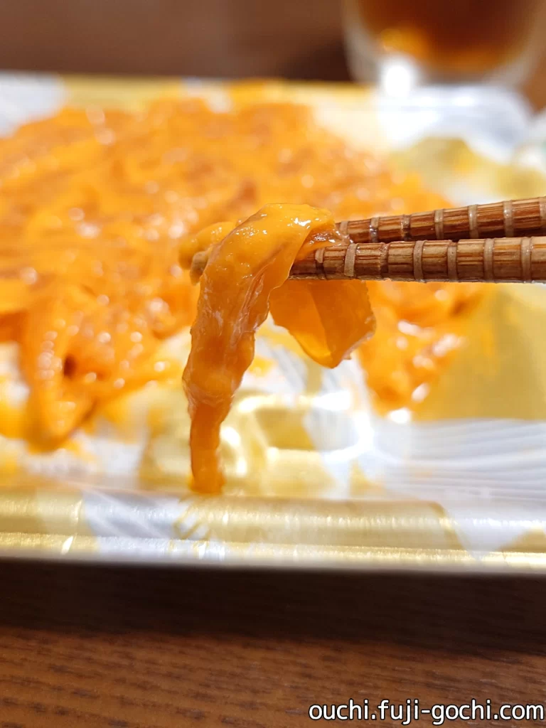 甘さと塩辛さのバランスがいい。酒粕、酒精によるアルコール香があり、ビールや日本酒を誘引する。香料の向こうにウニの味が感じられないでもないが、このほんの少し加える本物のウニで違いが出るんだよ、とでも言いたげだ。くらげのコリコリ食感に、ねっとり絡む濃厚な調味料。期待した通り、いやそれ以上に、ザ・うにくらげ。すぐに無くなってしまった。また買おう。