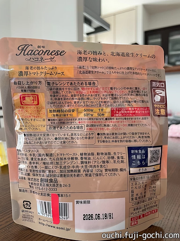 さて、これまで申し上げてきたようにハイクオリティなこの商品「ハコネーゼ 海老の旨みたっぷり濃厚トマトクリームソース」。これを絡めたパスタにも、足りないものがある。それは一体何か(ネットリ)。それすなわち、具。たとえば、イカやホタテなどの魚介、きのこやほうれん草を、ひと手間加えてみる。下味は最低限で良い。むしろそれで、ちょうど良い塩梅になる。私が思うに、完成度が高く味の濃いソースは、どうしても飽きやすい。だからこそ、そのまま麺に掛けるだけでは勿体無い、と、あえて意義を申し上げたい。どうせならもっと、もっと。一皿分のパスタソースが持つポテンシャルを、私は信じています。