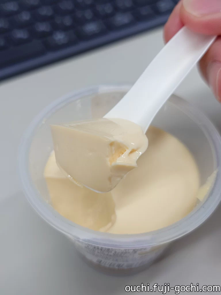 原材料にゼラチンとあって少し心配したが、それを感じさせない、サクッとしたスプーンの刺さりと柔らかな口どけ。卵味が美味しく、甘さもほどほどでGOOD。