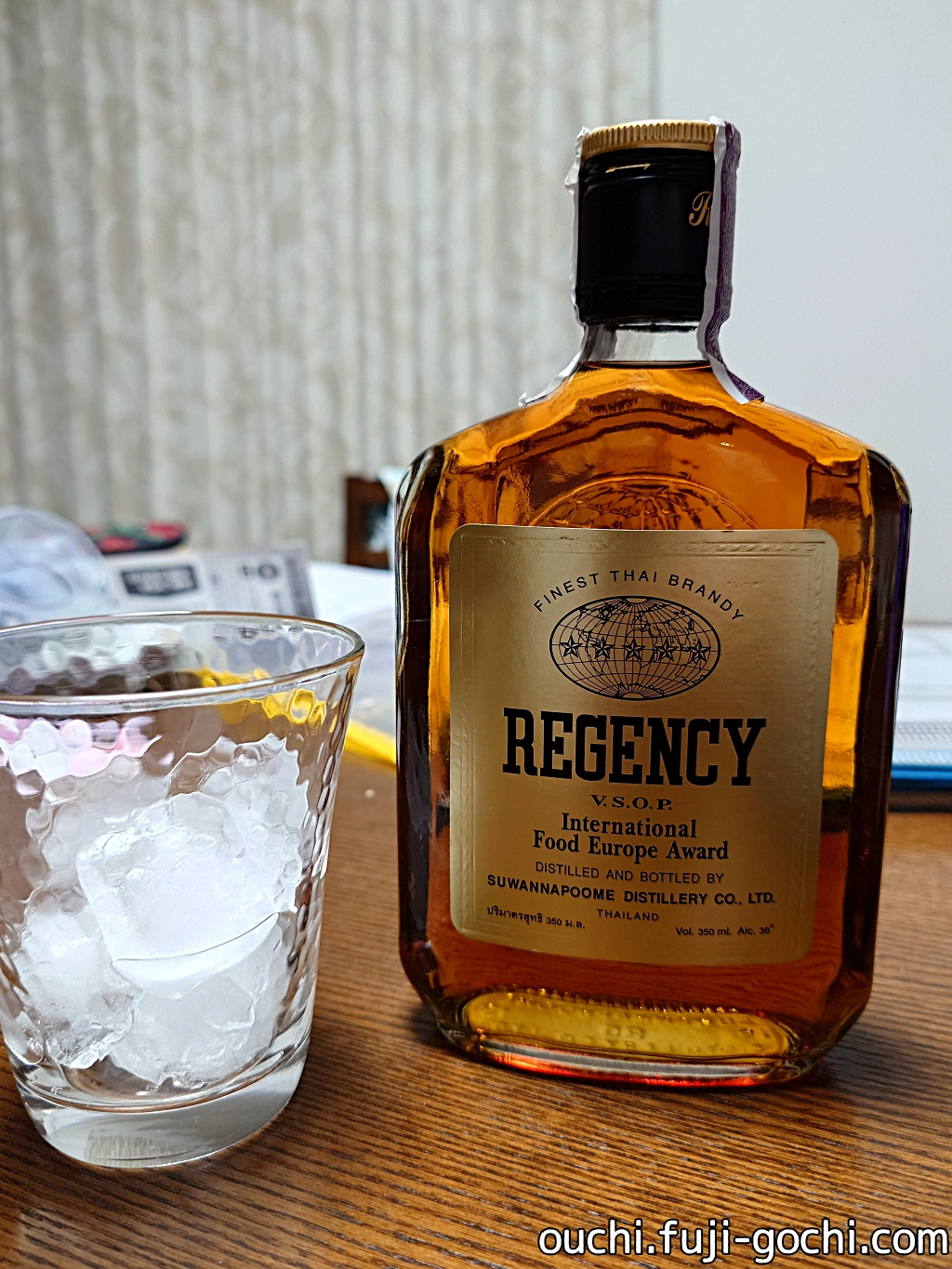 もらい物の酒。タイ産のブランデー。ブランデーは普段飲まないのでどうしたものか。そもそもブランデーのことをよく知らないが、VSOPと聞くと何か良いブドウ酒というイメージ。ベリースペシャルオールドなんちゃら。とりあえずロックで飲んでみた。甘い。親しんでいるウイスキーと比べると舌と喉に纏わりつくようなが感覚がある。カラッとしてスモーキーなウイスキーと比べて、フルーティーでふくよかな甘みがある。ややクセがあり、しかし、飲みやすい。ドン・シモンのグレープフルーツジュースで割ってみると、さらに飲みやすいカクテルになった。REGENCY、良い酒だとは思うけど、ただ、同じジュースで割るにしてもジョニ黒のほうが好きかなあ。個人の感想だけど。ブドウより麦派の私の嗜好を再確認した。