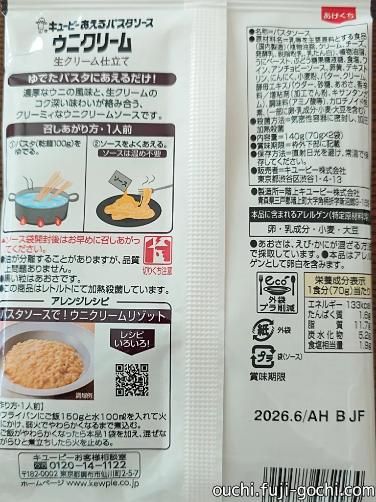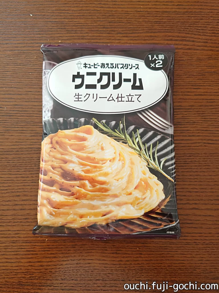 驚くほど食べやすく、しかもウニを実感できるウニクリームソースです。麺に絡みつくトロトロのソースには、ウニの風味が確かにあります。決して強いとは言えませんが、それでも「ウニの味がする」と確信できる程度にある。一方で、これ以上に強いと今度は「臭い」と感じる人が出るであろう、絶妙な加減と言えます(個人的にはもう少し強くても良い)。塩味、旨味、クリームのやさしい風味、すべてが主張しながらも、お行儀よく並んで座っているイメージ。何より驚きなのは、原材料に「香料」の記載がないことです。このクオリティは尋常ではない。あえるパスタソース全般的に言えることだが、麺だけでは勿体ないので、できるなら自前で具を足しましょう。さらに追いウニができると、もう市販品の域を超えてくるでしょう。