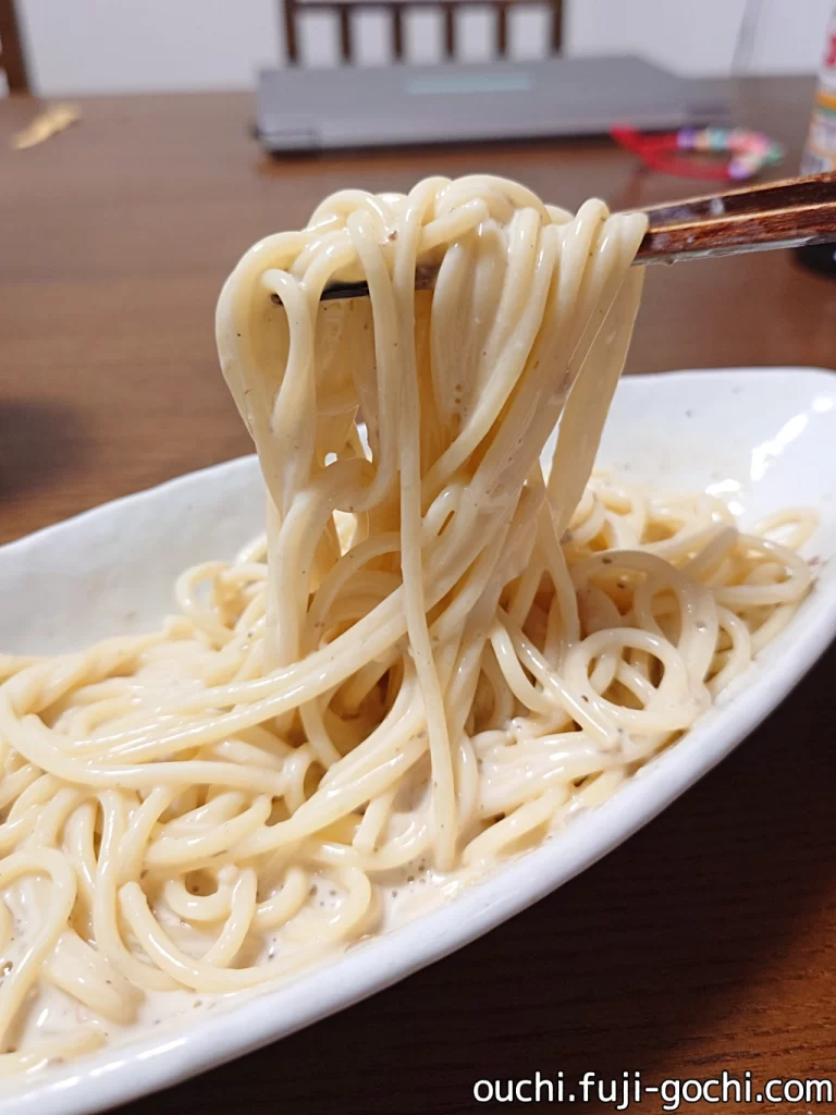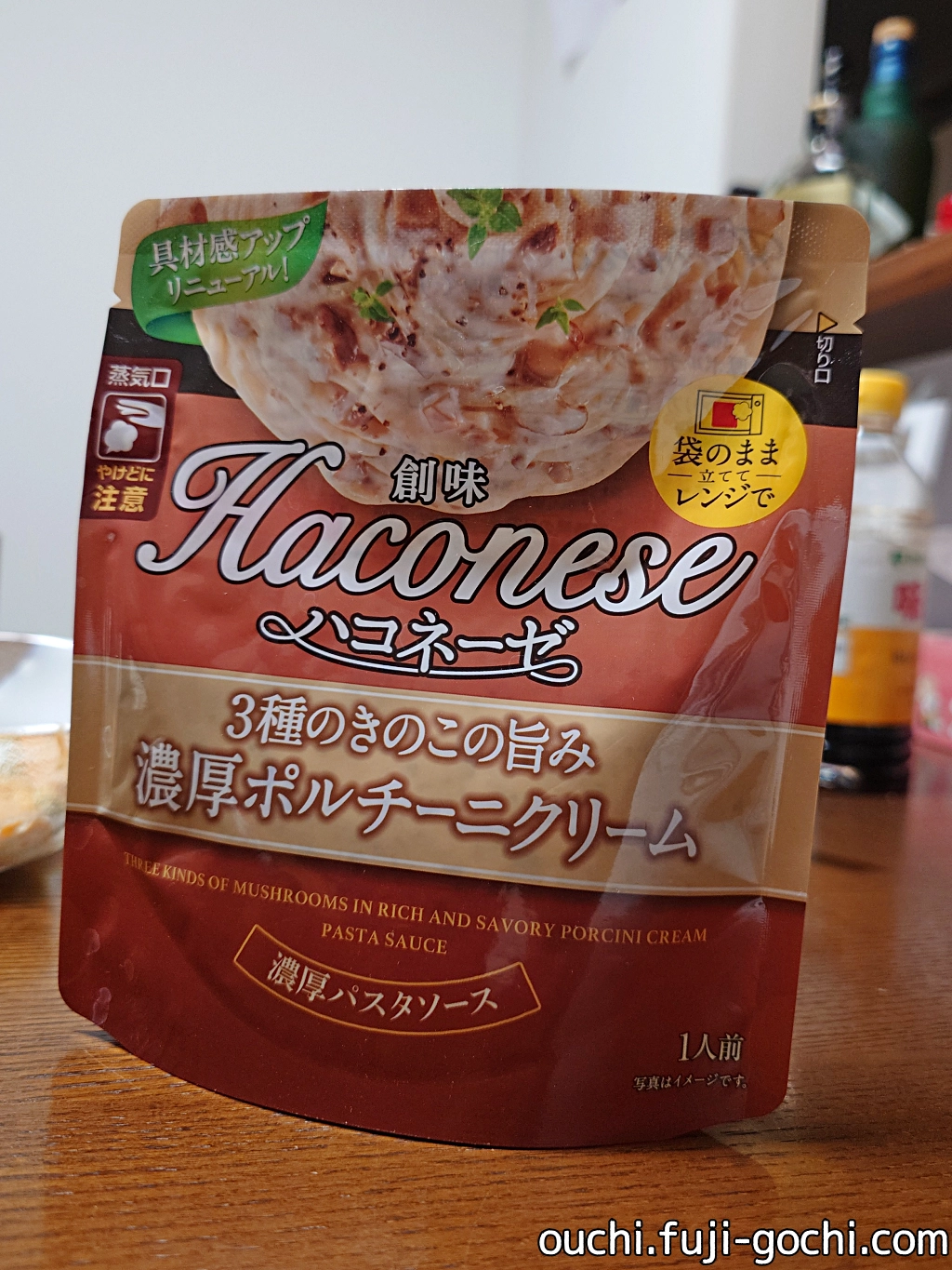 パスタによく絡むとろみのあるソースは、ちょっと贅沢に思われるほどたっぷり多めです。たっぷたぷ。追いきのこ、鶏肉、魚介などの具材をトッピング、あるいは乾麺100gから150gに増量したとしても、十分に濃厚さを享受できそうです。麺を食べたあと皿に残ったソースはバゲットなどパンにディップすれば残さず楽しめそうですし、素直にそうしたいと思わせます。