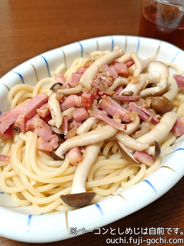 いわゆる和風のペペロンチーノ。カスみたいなベーコンとエリンギの欠片入り。具は自分で足そう。タイミングの悪いことにが、意識してソースの味を確かめる。タイミングの悪いことにマンチーニのスパゲッティに合わせたため相対的にソースが霞んでしまったが、意識してソースの味を確かめる。