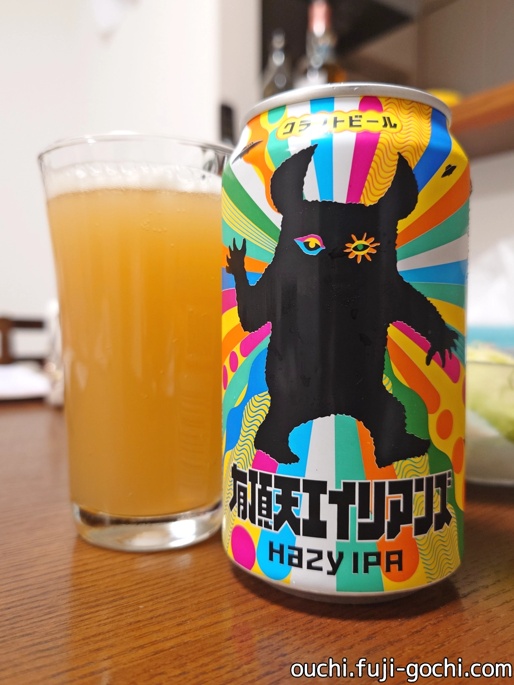 今回のビールは、ヤッホーブルーイングの有頂天エイリアンズ。ジャンルはヘイジーIPAで、共同開発者のセブンイレブンで販売しとる。麻薬を連想させるような奇抜でド派手な缶デザインに、狂気すら感じる。イカレてるんか?一周回ってイカしてるんか?僕にはよう判りません。