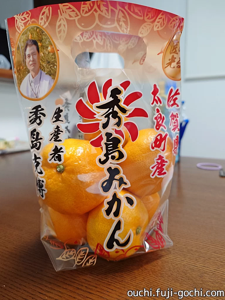 店には色々な種類のみかんが並んでいます。腕組みしながら売り場を3周し、分からないながらに色づきや大きさを確かめます。とりわけ鮮やかな橙色、立派と言えるサイズ感、みかんの房を太陽のようにあしらった粋なパッケージと、信頼できそうな秀島氏の顔写真に惹かれて「秀島みかん」を購入しました。