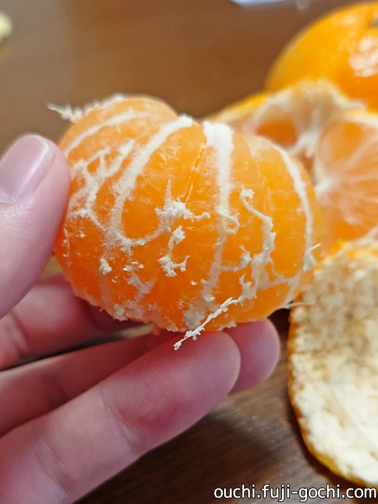 甘さは確かにありますが期待したほどではなく、ほんのり甘い程度でした。一方で、あふれ出す果汁のみずみずしさがスゴい。また、みかんの実を包む半透明の内袋(じょうのう膜)が薄くてやわらかい。普段ならこの薄皮を吐き出す5歳の息子がすんなり飲み込んだので驚きました。みかんの果実をムダなく味わえるのは素晴らしいことと思います。
