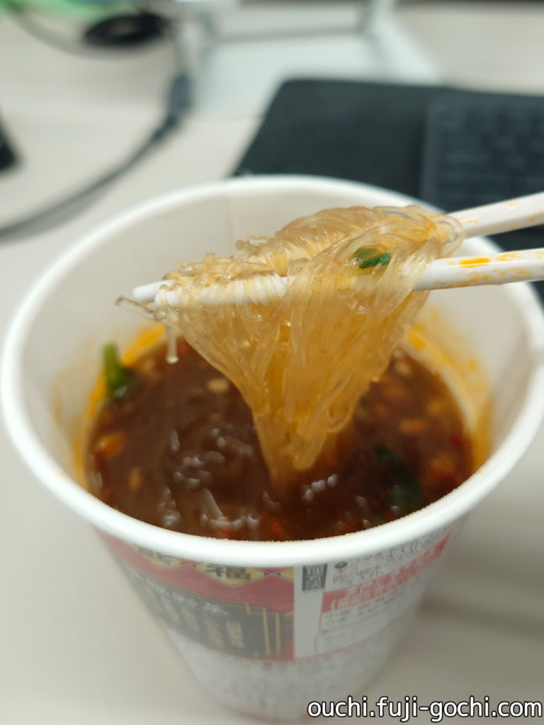 パッケージにもある「3種の醤」豆板醤、甜面醤、豆鼓醤、さらに山椒のシビレ(麻)を感じる中華の味わい。想像以上に本格的ですね。少しとろみのあるスープが春雨に絡んで、ずっと熱々の旨辛。割としっかり辛い。